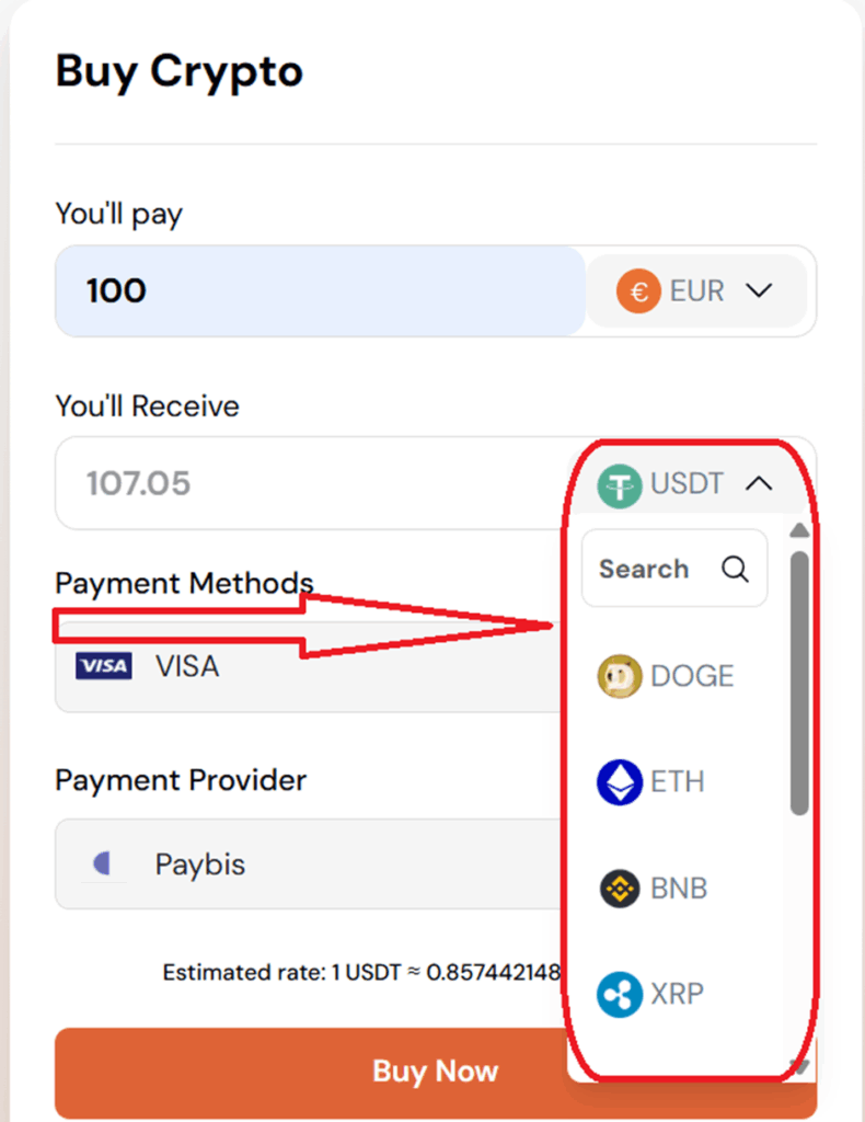 Once you pick your crypto, pick the fiat currency you want to use (like INR, USD, etc.). The system instantly shows the equivalent crypto you’ll receive.